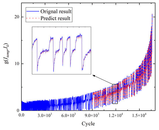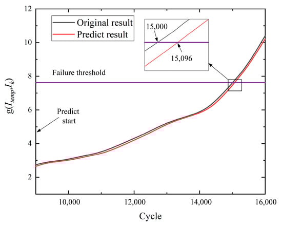 Figure 13 shows the predicted curve after it was filtered. At HSV failure, the EOL was 15,000. The EOP was 15,096 when Kp was at the start of the degradation state. Therefore, the RUL(Kp), RUL(ae), and RUL(re) were 6096, 96, and 1.6%, respectively. Moreover, the predicted trajectory of the ARIMA–LSTM was consistent with the original trajectory.