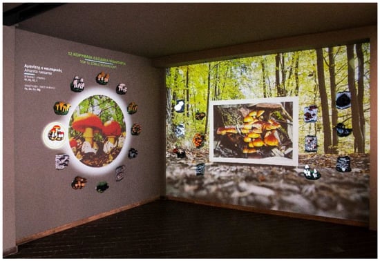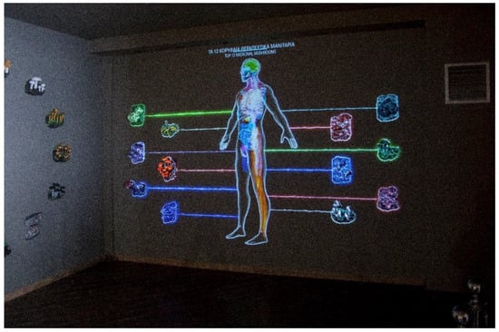 The Museum of Natural History of Meteora and the Museum of Mushrooms acquired a new wing, which concerns the nutritional and therapeutic value of mushrooms. To create this wing, a new technology was used, the so-called “Spatial Augment Reality”. This is the first time that this innovative technology has been used in a permanent museum exhibition in Greece, while there are few reports for its use in museums abroad. Where they do not exist, the screenings are performed in 2D, while in the Museum, they are performed on 3D-sculpted mushrooms. This innovative technology is based on color pixel mapping, but also on the projection of graphics on a multi-level surface by a projection machine (multiplayer projection mapping). In this way, the new wing of the Museum, which has as its object the nutritional value of mushrooms, is highlighted through a feast of colors, which makes the museum experience unique. In order to cultivate the motivation, interest, and pleasure of the visitors through experiential actions, a 3D interactive exhibit of the human body was designed in the form of an interactive exhibit that in the simplest, most ingenious, and supervisory way presents the benefits of mushrooms in specific organs (Figure 1).