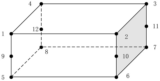 Figure 2 shows the distribution of the 12 nodes of the 3D hole pressure cohesive cell. Nodes 1, 2, 3, and 4 form the upper surface of the cell; nodes 5, 6, 7, and 8 form the lower surface of the cell; and nodes 9, 10, 11, and 12 are the pore pressure nodes.