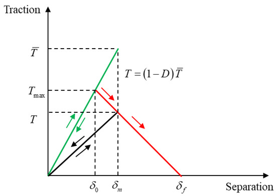 The damage mechanism of the cohesive unit follows the traction strain criterion, mainly based on the stress to which the unit is subjected as the basis for unit damage and failure. Before the damage of the unit, the displacement of the unit should be proportional to the stress. When the stress reaches the ultimate strength of the material, the unit begins to damage, the stress that can be withstood with the increase in displacement gradually decreases to zero, and then the unit fails.