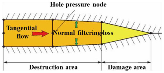 The fluid flow in the damage area of the cohesive cell is divided into the flow along the tangential direction and the normal filtration loss perpendicular to the upper and lower surfaces of the cohesive cell, as shown in Figure 4.
