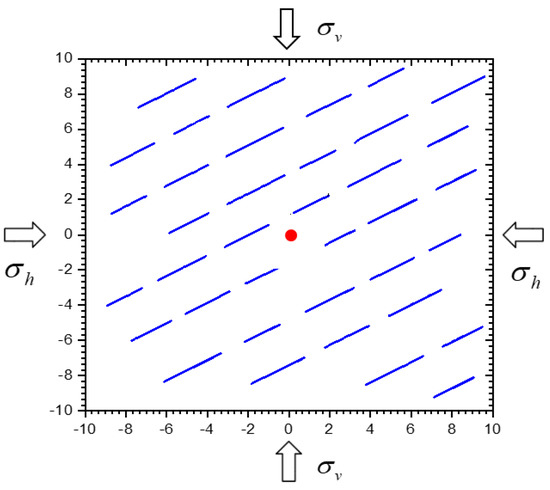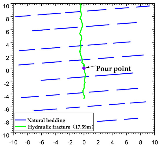 Hydraulic fractures usually produce complex fracture morphologies when expanding in shale reservoirs, while weak surfaces such as shale laminae and natural fractures present in the shale oil reservoirs can have an important impact on the hydraulic fracture expansion behavior and the final fracture distribution characteristics during fracture modification. In this paper, the expansion process of hydraulic fractures in a reservoir is simulated by using the method of globally embedded cohesive units. The modeling process requires prespecifying the distribution location and morphological characteristics of the laminar joints, so the corresponding preprocessing script files are written in the Python language, and different types of laminar joints are flexibly arranged by the idea of parametric modeling. The computational model is shown in Figure 6. The model size is 20 × 20 m, and the injection point is located at the center of the model (i.e., (0,0)). Ten laminar surfaces are initially set, and each laminar surface is composed of several microlaminates with a length distribution of 2–4 m. The laminar joints are spaced at 1–2 m, and there are 37 laminar joints in the whole model. The laminated joints have no initial opening, the angle with the x-axis is 30°, the x-direction is the minimum horizontal principal stress direction, and the y-direction is the vertical principal stress direction.
