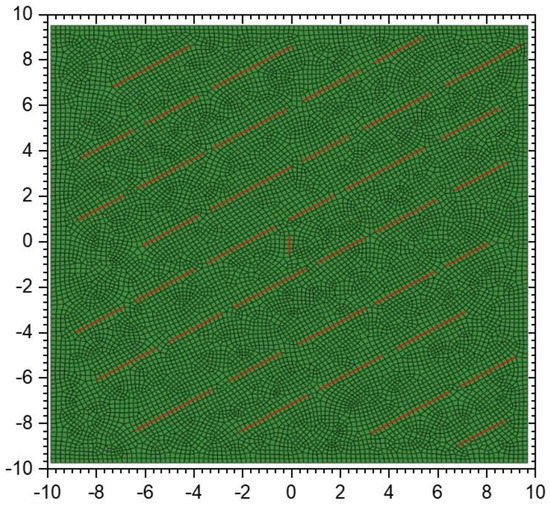 The grid division is shown in Figure 7. The computation area is divided by a quadrilateral grid, the cell type is CPE4P, the cell size is approximately 0.2 m, and there are 59,612 nodes and 35,449 cells in the model, including 11,883 quadrilateral block cells and 23,566 cohesive cells. The cohesive cell type is COH2D4P. The outer boundary of the model is subjected to fixed displacement and impermeable boundary conditions, where the upper and lower boundaries constrain the displacement in the y-direction and the left and right boundaries constrain the displacement in the x-direction.