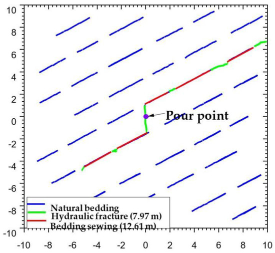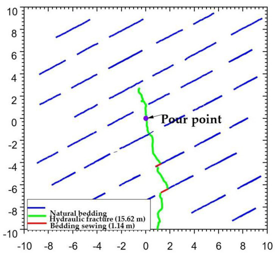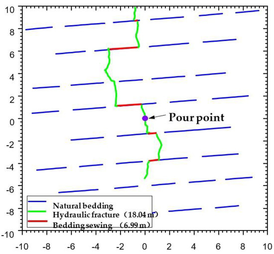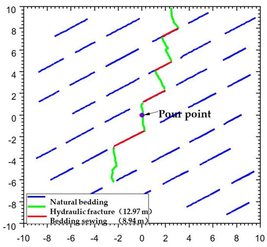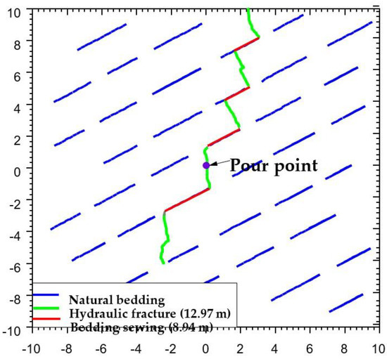 Figure 11 and Figure 12 show the geometry of the seam network formed when the ground stress difference is 2 and 6 MPa, respectively. Compared with the case where the difference in ground stress is 0 MPa, the hydraulic fractures still expand in the direction perpendicular to the minimum horizontal principal stress after intersecting with the laminae. When the difference between the overlying rock pressure and the minimum horizontal principal stress increases to 6 MPa, it can be seen that the hydraulic fractures tend to pass directly through the laminae joints, resulting in a decrease in the number of activated laminae joints. This is mainly because the greater the difference in ground stress is, the greater is the value of positive stress on the laminated joints, and the less likely they are to be activated.