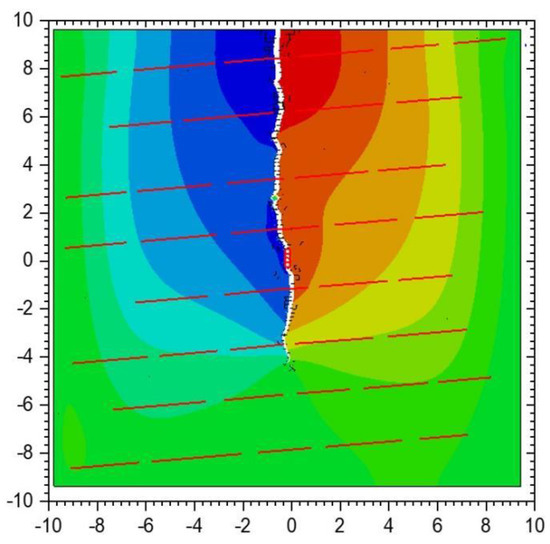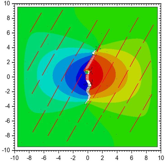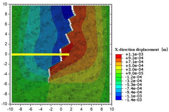 After the hydraulic fracture starts to crack from the injection point, it expands along the direction perpendicular to the minimum horizontal principal stress. After encountering the first group of laminated joints, the hydraulic fracture turns along the laminated joints because the tensile strength of the laminated joints is lower than the tensile strength of the shale matrix, and when the hydraulic fracture continues to expand and meets the second group of laminated joints, the hydraulic fracture continues to expand along one side of the laminated joints. Meanwhile, on the other side of the laminated joints, it does not continue to expand, which is mainly because as the width of the hydraulic fracture increases, the stress state on both sides of the laminated joints on both sides of the intersection point is different, and the laminated surface on the right side of the intersection point tends to open in tension, while the laminated joints on the left side of the intersection point tend to close in compression. When the hydraulic fracture expands to the tip of the laminated joints, under the superposition of both the crack-tip-induced stress field and the far-field stress, the hydraulic fracture undergoes a certain deflection and re-expands in the direction perpendicular to the minimum horizontal principal stress. The intersection behavior of the hydraulic fracture and the laminar joints in the subsequent expansion process is similar to the above process. The total length of the fracture formed at the end moment of fluid injection is 21.91 m, among which the length of the activated lamina joints is 8.94 m and that of the formed hydraulic fracture is 12.97 m. Figure 9 shows the displacement field in the x-direction in the rock at the end moment of injection, from which it can be seen that the maximum seam width of the hydraulic fracture is approximately 1.1 mm, while the width of the lamina joints is significantly smaller than the width of the hydraulic fracture. In addition, in this calculation, the laminated seam not only occurs normal to the tension but also has a certain degree of shear deformation. The presence of laminated joints not only affects the expansion path of hydraulic cracks but also affects the fluid pressure inside the cracks.