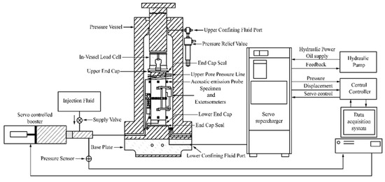 - Stress loading: The specimen is placed in the triaxial high-pressure chamber. The circumferential and axial pressures are loaded to the specified values in turn, and they are maintained for 10–20 min to ensure uniform stresses inside the specimen.