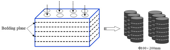The specimens used in this test are marine shale outcrops of the Longmaxi Formation, Shiqiao Township, Jiangkou Township, Wulong District, Chongqing, China. According to the requirements of the fracturing physical mode experiment of shale cylindrical specimens, 40 cylindrical specimens of Φ100 mm × 200 mm were drilled in the vertical lamina direction, and the upper and lower sections of the specimens were polished by a core end smoothing machine to ensure that the parallelism of the upper and lower surfaces was controlled within ±0.02 mm. The processing flow of the cylindrical specimens is shown in Figure 21.