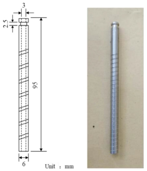 According to the design requirements of the simulation experiment, a simulated borehole with a diameter of 12.0 mm and a depth of 113.5 mm was drilled in the center of the cylindrical specimen, and a section of stainless steel tubing with an outer diameter of 6.0 mm, a wall thickness of 1.5 mm, and a length of 95.0 mm was buried as the simulated casing. Kraft K-9741 epoxy resin potting adhesive was used to seal the casing to the wellbore. To ensure sufficient bonding strength between the simulated casing and the wellbore, a rotary thread was machined on the outer surface of the simulated casing to increase the contact area between the casing and the glue; meanwhile, a ring-fitted recess was machined on the top of the casing to allow sealing treatment through a high-strength rubber seal. The dimensions of the simulated casing and the physical object are shown in Figure 22.