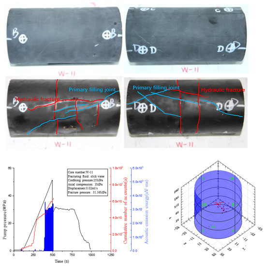 The native filling joints in the W–11 specimen were very developed (marked by blue lines in the Figure 24), and the experiments were conducted by applying 25 MPa of circumferential pressure and 3 MPa of shaft pressure and injecting slick water into the wellbore at a constant rate of 0.02 mL/s. It can be found through the experiments that after the pump pressure exceeded 1 MPa, the pump pressure increased linearly with time, and when the pump pressure rose to 51.36 MPa, the pump pressure dropped steeply, and the rupture was instantly detected. A large amount of acoustic emission time and high-amplitude acoustic emission energy were detected instantaneously, and the differential stress between the pump pressure and the surrounding pressure was 26.36 MPa at this time. The native filling fractures in the shale were partially opened after the pressure, and part of the native fractures were not only completely opened but also expanded to some extent. There are still two types of hydraulic fractures: one is two hydraulic fractures roughly symmetrical along the borehole axis, and the other is a laminated seam perpendicular to the borehole axis. Two of the three laminated seams are not fully extended through, and one laminated seam crosses the entire core.