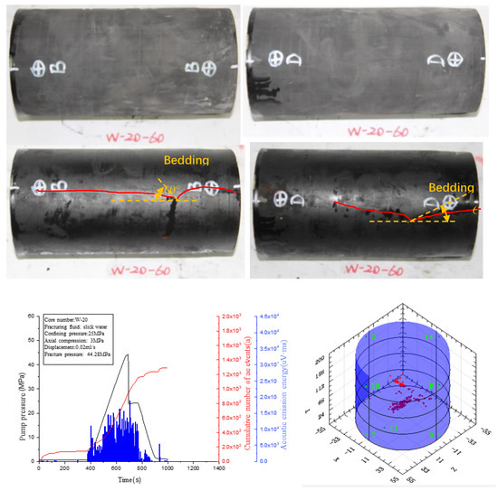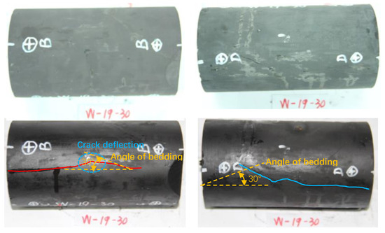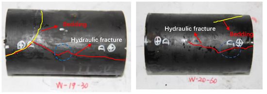 The W–20 rock sample was drilled at an angle of 60° to the laminae, and there were no obvious cracks or defects on the surface of the rock sample before the experiment. After the experiment, hydraulic fractures were formed on the two symmetrical flanks, and obvious fracture deflection could be observed on the fractures on both flanks. The photograph of the specimen W–20 after the test and the pumping pressure curve are shown in Figure 27. The deflection angle was approximately equal to the angle between the laminae and the borehole axis at the deflection point, and the deflection angle gradually decreased with the expansion of the fractures and, finally, was roughly parallel to the borehole axis.