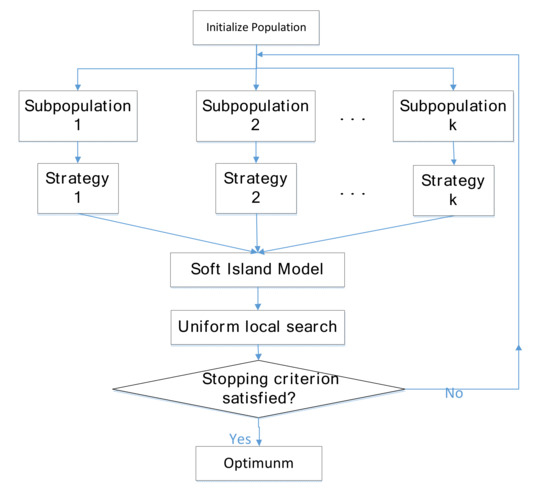 In the above mentioned improved algorithm, the diversity of the population becomes worse in the process of evolution. Therefore, the island model was introduced into the evolutionary algorithm to improve its performance. MPCCA [34] is a cooperative algorithm with many populations, in which the population is split into many subpopulations according to individuals with different directions. MPEDE [35] is proposed by Wu et al. to generate a collection of multiple strategies, which concurrently consists of three differential strategies: “current-to-pbest/1”, “current-to-rand/1”, and “rand/1”. Tong et al. [36] proposed an improved multi-population ensemble differential evolution (IMPEDE). With IMPEDE, a novel efficient mutation strategy “DE/pbad-to-pbest” is proposed, reserving the best individuals and the worst to balance the exploitation and the exploration. Moreover, IMPEDE utilizes the weighted Lehmer mean method to promote parameter adaptation. Li et al. [37] proposed a differential evolution algorithm with multi-population cooperation and multi-strategy integration (MPMSDE), which uses strategy rankings to allocate computational capacities to different strategies. The new strategy “DE/pbad-to-pbest-to-gbest” can not only accelerate the convergence of DE but also balance the exploration and exploitation. As a result, the use of multiple populations and strategies contributes to an improved DE performance. However, the migration mechanism and local search ability of the population need to be further improved.