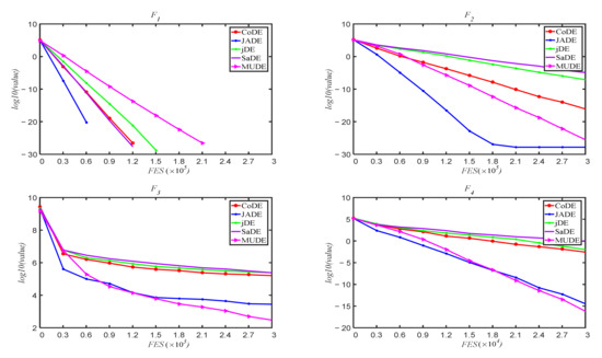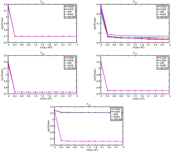 To illustrate the convergence of algorithm, fitness variation graphs of the 25 functions were made for the convergence course, which includes the mean fitness values over 25 runs with dimension D = 30. Figure 4 shows the convergence graphs of the 25 functions. In Figure 4, MUDE can continuously converge to better solutions for the unimodal function, but for the multimodal function, the algorithm may get stuck in a local solution. For function F18–F24, convergence curves are almost the same. In general, MUDE improves the convergence of the DE algorithm.