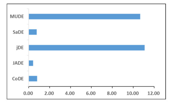 Furthermore, the total running time of the 25 functions is compared in five different DE algorithms, as shown in Figure 5.