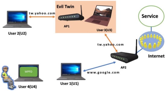 The WPFD could detect evil twins in most situations. However, there are still some unique situations in which an evil twin could bypass the detection of WPFD. This subsection describes the scenarios. In the first scenario, an evil AP still uses a good AP to connect to the Internet. But the evil AP uses an SSID different from the good APs and attracts victims to connect to it through other methods such as karma attacks [33]. Even though this scenario is not an evil twin attack, according to the definition of evil twins, we still describe this scenario as a situation that WPFD cannot handle. In the future, we plan to solve this problem by letting WPFD observe the packet-forwarding behavior of all APs in a wireless network.