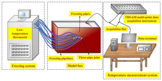 Figure 1 shows the tunnel horizontal freezing model test system, which includes a model box, freezing system and temperature measurement system.