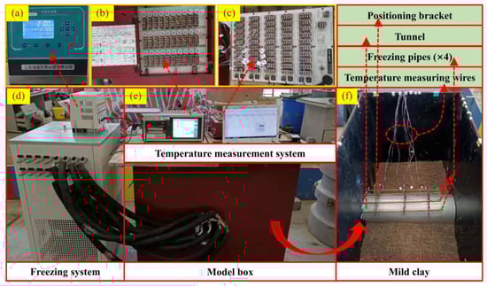Tunnel horizontal freezing model test system: (a) the control panel of low-temperature constant temperature bath; (b,c): TDS-630 multi-point data acquisition instrument; (d) low-temperature thermostat; (e) model box; (f) mild clay and freezing pipes in the model box.