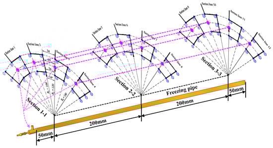 A TDS-630 multi-point data acquisition instrument in Figure 2b,c was selected to record temperature, and the acquisition frequency was set as 1 min/time. In this model test, three temperature measurement sections were set along the length direction of the freezing pipe, that was 50 mm, 250 mm and 450 mm from the orifice of the freezing pipe. At each temperature measurement section, there were 23 measurement points in the soil and 4 measurement points on the freezing pipe wall, as shown in Figure 3.