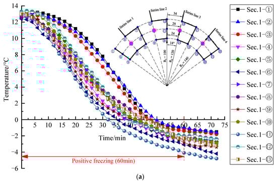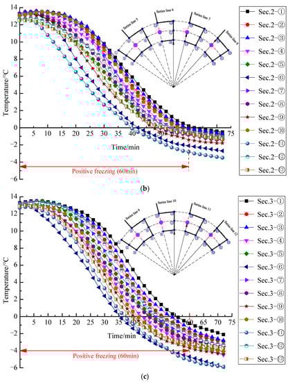 Figure 4 shows that the temperature drop curves of the measurement points suffer from three periods: steep drop, slow drop and tending to be stable. The temperature of the measurement point between the adjacent two freezing pipes decreases faster, while that outside the freezing pipe decreases slower. Figure 4a shows that the temperatures of measurement points are all below –1 °C after freezing for 55 min. The temperature drop rates of measurement point ⑪ are 0.365, 0.182 and 0.024 °C/min at three periods; Figure 4b shows that the temperatures of measurement points are all below –1 °C after freezing for 70 min. The temperature drop rates of measurement point ⑪ are 0.318, 0.120 and 0.011 °C/min at three periods; Figure 4c shows that the temperatures of measurement points are all below –1 °C after freezing for 60 min. The temperature drop rates of measurement point ➅ are 0.334, 0.148 and 0.019 °C/min at three periods.