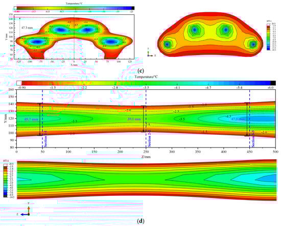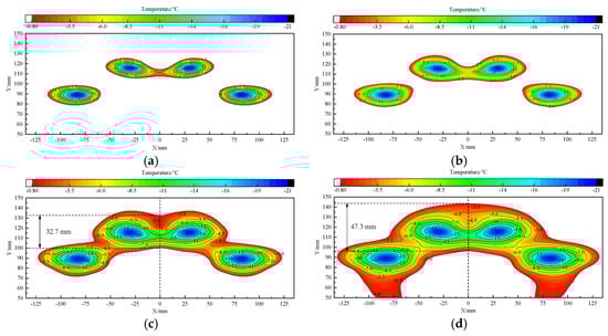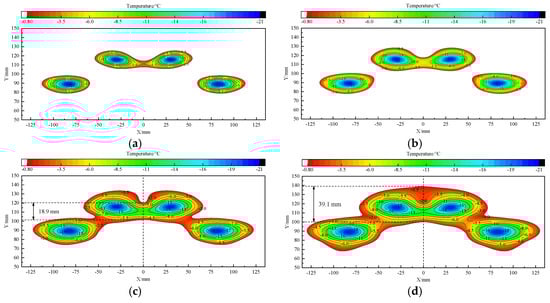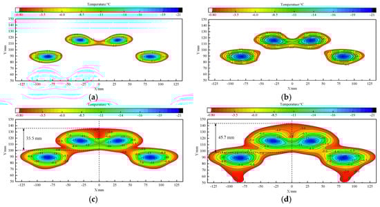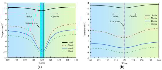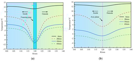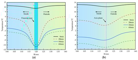 Figure 9, Figure 10 and Figure 11 show that the temperature curves on the main and vice planes of the frozen wall present a “V” type; specifically, the temperature on the axis plane is the lowest, while it gradually rises with the increase in distance to the axis plane. Moreover, the temperature curve near the inner and outer edges (R = 100 mm and R = 140 mm) of the designed frozen wall tends to be flat, and the temperature at the inner edge (R = 100 mm) is always lower than that at the outer edge (R = 140 mm) during freezing for 60 min. It indicates that the dissipation capacity of the cooling capacity inside the axis plane of the frozen wall is less than that outside the axis plane.