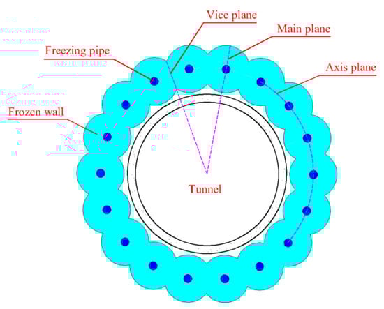 To quantitatively analyze the non-uniformity of temperature distribution at three sections, the temperature on two characteristic planes (the main and vice planes) of the horizontal frozen wall are selected to draw curves. Where the main plane refers to the characteristic plane passing through the center of the tunnel and each freezing pipe, the vice plane refers to the characteristic plane passing through the center of the tunnel and the midpoint of the connecting line between adjacent freezing pipes, while the axis plane refers to the arrangement circle of freezing pipes, as shown in Figure 8.