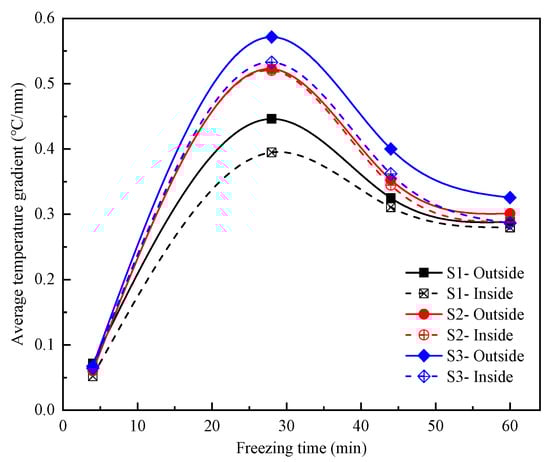 Figure 12 shows that the average temperature gradient at the inside and outside of the frozen wall first increases, then decreases and finally tends to be stable with the increase in freezing time. At Section 1-1, after freezing for 4 min, the average temperature gradient outside the axis plane is only 0.07 °C/mm, while it is 0.05 °C/mm inside the axis plane. After freezing for 28 min, the average temperature gradient outside the axis plane is only 0.446 °C/mm, while it is 0.395 °C/mm inside the axis plane. After freezing for 44 min, the average temperature gradient outside the axis plane is only 0.325 °C/mm, while it is 0.311 °C/mm inside the axis plane. After freezing for 60 min, the average temperature gradient outside the axis plane is only 0.288 °C/mm, while it is 0.280 °C/mm inside the axis plane. It is obvious that the average temperature gradient on the outside of the frozen wall is more than that on the inside of the frozen wall. Moreover, the order of the value of the average temperature gradient at three sections is Section 3-3 > Section 2-2 > Section 1-1.
