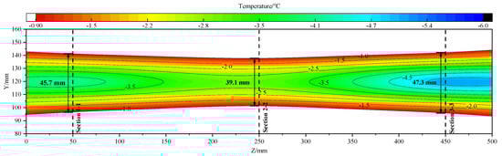 Figure 13 shows the morphology of the frozen wall, which is thicker at the ends and thinner in the middle; it is intuitive and obvious that the frozen wall is non-uniform. The average thickness of the frozen wall at three sections after positive freezing for 44 and 60 min is shown in Figure 14.