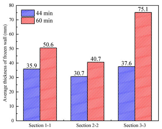 Figure 14 shows that the average thickness of the frozen wall at three sections is not all equal after freezing for 44 min and 60 min. After freezing for 44 min, the average thickness of the frozen wall at Sections 1-1, 2-2 and 3-3 is 35.9 mm, 30.7 mm and 37.6 mm, respectively; after freezing for 60 min, the average thickness of the frozen wall at Sections 1-1, 2-2 and 3-3 is 50.6 mm, 40.7 mm and 75.1 mm, respectively. The order of the average thickness of the frozen wall at three sections is Section 3-3 > Section 1-1 > Section 2-2, which presents the non-uniformity of a frozen wall along the length direction of the freezing pipe.