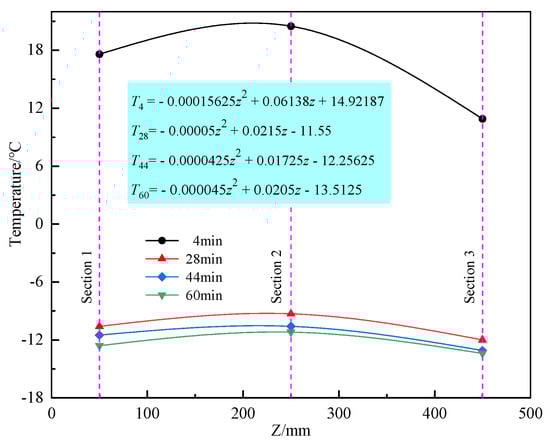 Figure 15 shows that the pipe wall temperature first increases and then decreases along the length direction of the freezing pipe, where it reaches the maximum at Section 2-2. After freezing for 4 min, 28 min, 44 min and 60 min, the temperature fitting functions are as follows: