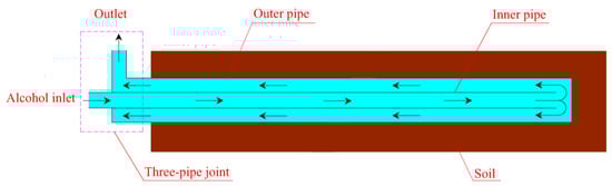 As shown in Figure 2a,d, the freezing equipment adopted the low-temperature thermostat produced by Jiangsu Hengnuo Instrument Manufacturing Co., Ltd. (Nanjing, China), which allowed alcohol to maintain a temperature of −21 °C for cycle operation. The test time was set as 72 min, where the positive time was 60 min, and the design thickness of the frozen wall was set as 40 mm. In this model test, 4 freezing pipes with an outer diameter of 8 mm were determined by the equivalent heat transfer and similarity criteria, and these pipes were symmetrically distributed above the tunnel at an angle of 28°. The structure of the freezing pipe is a coaxial sleeve, and the circulation mode of alcohol is entering from the inner pipe and leaving from the outer pipe, and its flow rate is 1.2 m3/h, as shown in Figure 3.