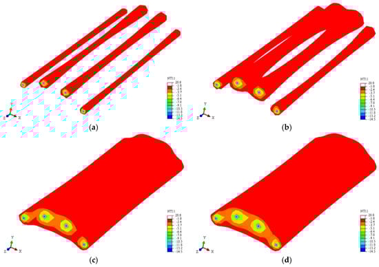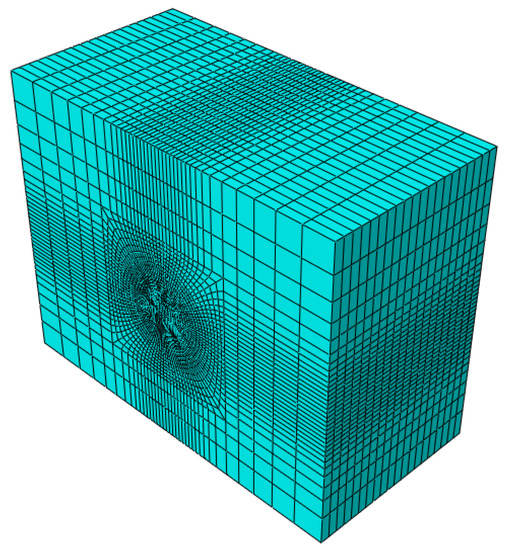 Figure 17 shows that the model size is 1000 mm × 800 mm × 500 mm. The element type is DC3D8 with good heat-transfer capability, and the number of elements is 59120, where the four freezing pipes are simplified as linear heat sources, and each freezing pipe consists of 25 linear elements.