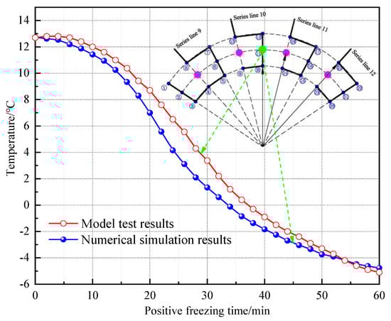 As shown in Figure 18, the numerical simulation results are basically consistent with the model test results; the two curves both show a change process of steep drop first, then slow drop and finally stabilized. The difference between them mainly occurs at the steep drop stage, where the model test results are always lower than the numerical simulation results, and the maximum reaches 2.5 °C. The difference in refrigerating capacity may be due to the unstable ambient temperature in the laboratory or the influence of some unpredictable factors; that is, the model test results may have errors in reflecting the development of freezing temperature field. In contrast, the numerical simulation results can reflect the development of the freezing temperature field more reasonably.