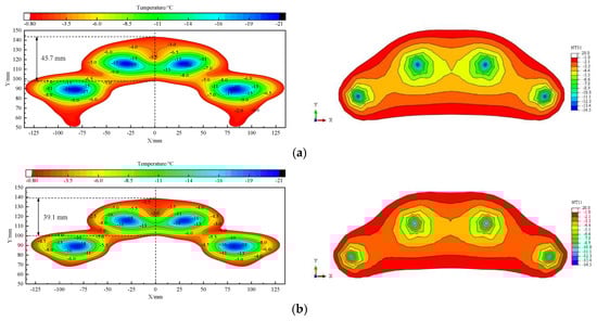 The comparison of the freezing temperature field calculated by numerical simulation and model test is shown in Figure 20 after freezing for 60 min.