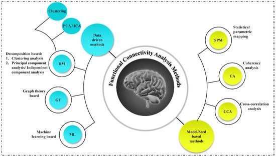There are several prominent methods of assessing FC (using the BOLD signal): seed-based, decomposition methods: principal component analysis (PCA) and independent components analysis (ICA), graph theory, etc. [4]. Another assumption to differentiate these methods is model-based and data-driven (Figure 1). Model/seed-based methods, for example, coherence and cross-correlation analysis and statistical parametric mapping, require prior knowledge of processing and are easy to implement hence widely used in neuroimaging [5]. Data-driven methods require no prior knowledge and investigate the multivariate structure of data using decomposition and clustering [6]. Recently, a wide variety of different machine learning algorithms for rs-fMRI analysis have been focused on unsupervised learning approaches.