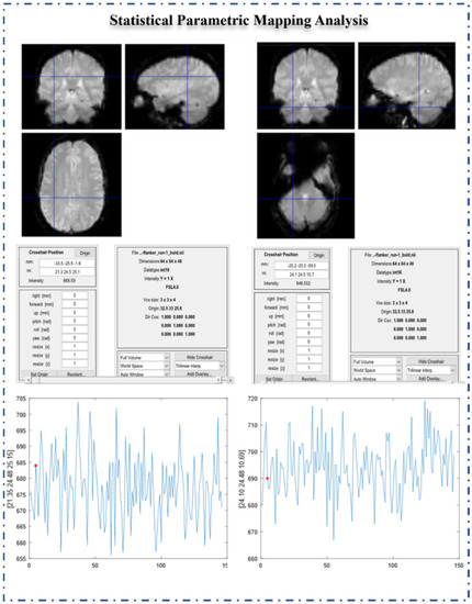 SPM refers to the application of the general linear model (GLM) and Gaussian random field (GRF) theory in combination to produce classical inferences about spatially extended data using statistical parametric maps. SPM utilizes GLM to estimate the parameters that potentially explain the data and GRF to overcome the multiple comparison difficulties. Following scaling and filtering processes of the overall brain voxels, this technique averages the voxels in a specific seed. It uses it as a variable of interest in the first-level analysis, followed by a deeper analysis utilizing the random effect. MATLAB (2017b) and SPM12 are used to preprocess the fMRI data [30,31], and some sample fMRI images of random subjects and the volume (age-wise) time series are shown in Figure 4.