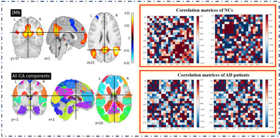 Regions of the default mode network similar to the PCC, ventral, precuneus and dorsal medial prefrontal cortex display more significant activity during rest, indicating that this network reflects the human brain’s baseline or default functioning [35]. The DMN has gained a great deal of attention in the rs-fMRI field [36,37]. Several studies have examined alterations in DMN resting-state connectivity in neurocognitive and mental disorders such as AD [38]. For fMRI data F having n voxels and t time points, the ICA model can be expressed as: