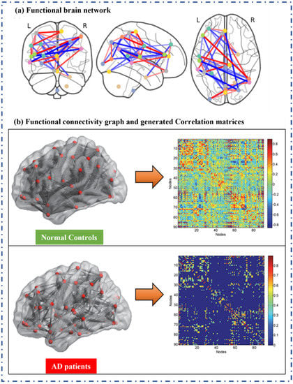 AD is a kind of brain disease similar to coronary artery disease (CAD) in the heart. It is a degenerative disorder as well, which means it becomes worse with time. AD is believed to begin 20 years or more before visible symptoms develop. Symptoms arise when nerve cells (neurons) in the brain involved in thinking, reasoning, and memory (cognitive function) have been harmed or damaged. One of the known causes of AD is the accumulation of β-amyloid protein between neurons that disrupts cell functions. A brief description of the pathophysiology behind this process is shown in Section 2. In neuroimaging, AD pathogenesis can analyze utilizing magnetic resonance imaging (MRI) to examine structural changes, fMRI to assess functional activation patterns, and PET can investigate functional and metabolic alterations utilizing radiotracers. Multi-modal neuroimaging seems to be the most successful method, but it is also the most expensive one. In past years, non-invasive and non-irradiating fMRI has become a popular tool in investigations of mild cognitive impairment and AD [3]. The FC, temporal and spatial connections between distinct brain areas and connectivity-based brain disorders may be investigated using the fMRI technique. The fMRI approach is a reliable tool for studying FC, temporal and spatial correlations among brain areas, and connectivity-based brain disorders such as AD, schizophrenia, bipolar disorder, traumatic brain injury, depression, addiction, etc.