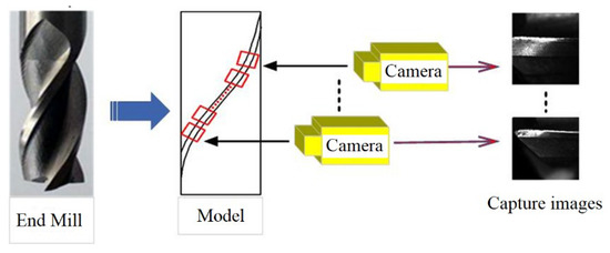 The acquisition method first establishes four image data containers to store images of different side edges. Periodically, four frames of end mill side edge images in the horizontal direction of the acquisition model are collected. Each frame of the image contains the information of each side edge. The collected images of each side edge are stored in corresponding containers, respectively, and this process is called the first layer collection. After the first layer is collected, while rotating the end mill clockwise, the spindle is moved down a certain distance so that the camera can collect the following wear area information of the first layer side edge image. At this time, the spindle stops moving downward, and the camera collects four frames of side edge images again and stores the corresponding container. This process is the second layer of collection. After that, the spindle moves down the same distance again, and the above process is repeated until the camera captures every side edge of the entire end mill. The image area acquired by each layer in the acquisition process is shown in Figure 4.