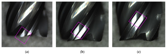 Original image datasets of 30 end mills were taken at different processing times and illuminations. Each milling tool corresponds to 12 images, reflecting the complete wear information of the milling cutter at the time of collection. Image enhancement processing (stretching, mirroring, gray value, and color gamut transformation) is performed on the part of the original dataset so as to improve the generalization of the VGG16 backbone feature network when extracting features and ensure that the FCN model can still obtain the correct detection results under different illumination and different contrast. After removing some unclear images, the total number of images is 3300. A total of 3000 side edge wear images constituted the training set, and 300 side edge wear images were used as the test set. The wear images of different local end mills collected using different parameters are shown in Figure 8.