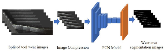 Visual monitoring methods can be integrated into intelligent manufacturing systems to obtain wear values [26]. In addition, with the advancement of machine vision technology, the training and learning of tool wear will provide more effective support for tool parameter selection, failure analysis, and tool design [23]. However, the tool structure is complex, and the acquisition resolution, frame rate, and viewing angle will significantly impact the acquisition method and acquisition quality of the tool wear image. At present, for tools with complex structures, such as milling cutters and drills, it is difficult to obtain complete and accurate wear area information due to their multi-edge and helical cutting edges. Therefore, only the local information on tool wear is usually collected, and the wear state of the tool cannot be thoroughly evaluated. The FCN network [27] is an improvement of CNN. The final full connection layer of the CNN network is replaced by convolutional layers. FCN classifies the pixel-level classification of images, thereby solving the problem of semantic segmentation. Different from CNN, FCN can accept input images of arbitrary size. It uses a deconvolution layer to upsample the feature map of the last convolutional layer to restore it to the same size as the input image so that a prediction can be generated for each pixel. At the same time, the spatial information in the original input image is preserved, and finally, pixel-by-pixel classification is carried out on the upsampled feature map.