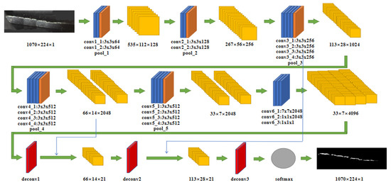 As shown in Figure 7, the FCN segmentation model contains a total of six convolutional layers. Each convolutional layer has a pooling layer for compressing the convolutional layer, and the ReLu (Rectified Linear Unit) activation function is added after each convolutional layer. The activation function is finally connected to the softmax classifier using three deconvolution layers, the input is a single-channel image of 1070 × 224 × 1, and the output is a binary image of 1070 × 224 × 1. Since the parameters of the convolution layer are determined by the parameters of the convolution kernel, the feature information of the wear area image of the end mill side edge can be extracted by controlling the parameters of the convolution kernel.