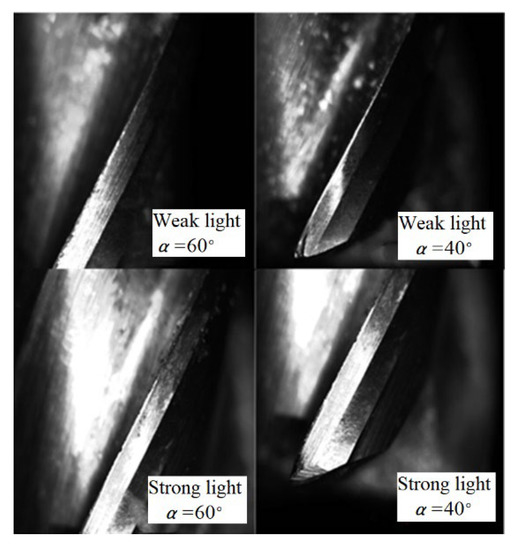 Fully considering factors such as the number of tool wear and image representativeness, the dataset is divided into the training set and validation set. Flank wear images of end mills were acquired under different cutting parameters and conditions. End milling cutters with α of 45° and 60° were selected, respectively, and cutting tests were carried out under high-speed and low-speed cutting conditions. LED lighting uses two conditions: intense white light and weak white light.