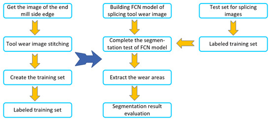 The hardware configuration of the experiment is based on Intel(R) Core(TM) 7200u CPU 2.71GHZ, NVIDIA GTX 1080Ti 11GB GPU, and Win10 operating system. Using Python and TensorFlow to reproduce the FCN model based on the VGG16 structure and complete the training and testing of the image segmentation of the wear area of the end mill side edge. The specific process is shown in Figure 10.