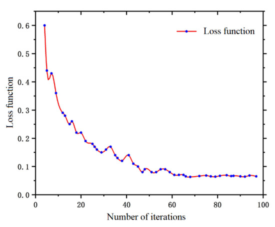 The training set and the validation set, respectively, are input into the FCN segmentation model mentioned above for training, and the softmax cross-entropy loss function (Equation (8)) is used to calculate the loss function value. After 100 iterations, the loss function converges to 3.3267 × 10−2, the training process duration is 6.8 h, the batch size is set to 1, the initial training speed is set to 0.001, and ADAM (Adaptive Moment Estimation) is used to optimize the algorithm. After the pre-training model based on local wear characteristics is obtained through training, the above 300 spliced end mill global wear data sets are trained using the pre-training model, and the obtained loss function curve is shown in Figure 11. As can be seen from the image, since the spliced end mill global wear data set uses the local features of the pre-training model, the loss curve has an obvious downward trend in the early stage of training and has begun to converge after 40 iterations. By 60 iterations, there is no evident fluctuation trend, and convergence is reached.