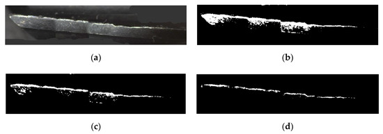 The purpose of using the segmentation algorithm is to identify the wear area of the tool effectively. It can be seen from Figure 12 that the above three algorithms can all segment the wear area of the tool, but the recognition accuracy of the Otsu threshold adaptive segmentation algorithm and the K-means clustering segmentation algorithm is relatively poor, and misrecognition occurs. Part of the non-wear area is identified as wear, especially the misidentified area of the Otsu threshold adaptive segmentation algorithm is large.