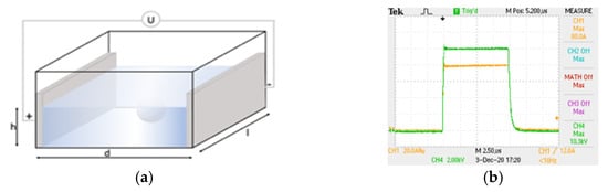 (a) Batch treatment chamber with volume V = h∙d∙l (cm3), where h (cm) is the height of the mixture, d (cm) the distance of the electrodes and l (cm) the width of the chamber. The voltage U (kV/cm) is applied between the two electrodes. (b) Voltage and current pulse example during the experiments, (green) voltage 2 kV/div, (yellow) current 20 A/div, 2.5 µs/div.