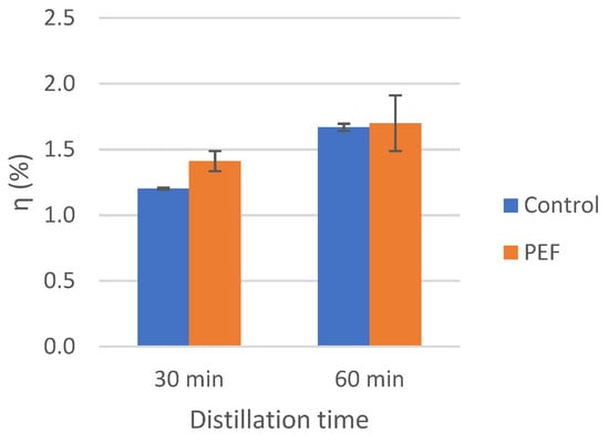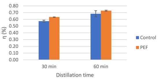 - In the case of rosemary, a similar effect with both distillation times, i.e., 30 and 60 min, was obtained, where the yield was not enhanced substantially. Additionally, 60 min distillation might not be enough to extract all EO present in 50 g of rosemary leaves, as there is still some yield variation with and without using PEF. Unfortunately, during the present work, it was not possible to further investigate this possibility due to the reduced material available.