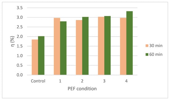 The PEF application was done varying different PEF parameters, leading to four different field strengths and specific energies delivery. The different PEF conditions applied are named from 1 to 4, where 1 represents the condition that deliver the lowest energy and 4 the one that delivers the highest energy. The yields obtained from the different extractions are shown in Figure 5.