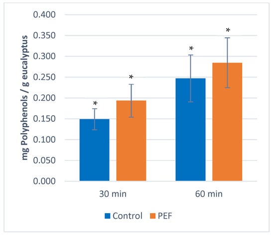 Results for TPC analysis of eucalyptus with (PEF) and without PEF application (Control) and different distillation times, phenols (mg/g eucalyptus). Vertical lines refer to the STDev. * Indicates statistical significance (p-value < 0.05).