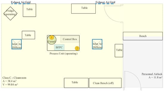 Room layout. For a comparison of the BioTrak® Biofluorescent Particle Counter (BFPC), (TSI Incorporated, Shoreview, MN, USA) with the classic Microbial Air Sampler (MAS), two different measuring systems were used: Merck Millipore RCS® (Merck Millipore, Darmstadt, Germany (1)) and ImpactAir® (Iso-Con Slit-to-Agar, Bridgend, UK (2)). All instruments were placed inside a process unit in the middle of the room.