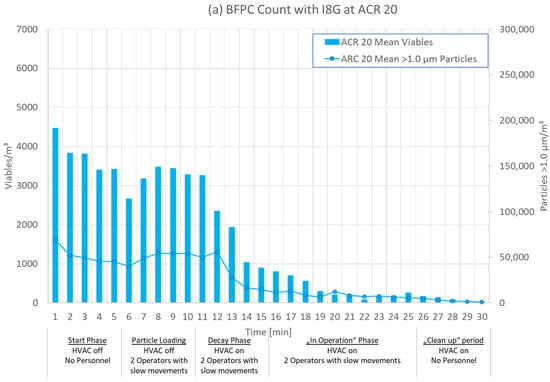 With this test design a controlled build-up and decay of particles and MCPs was intended. In the start phase, the HVAC was off. The BFPC and Microbial Air Samplers (MAS) were started, and the operators left the room for 5 min. As no particles and MCPs could be emitted by personnel, it was expected that in this phase the BFPC count would be constant or would marginally decrease by particle sedimentation. After five minutes the operators came back into the room, and moved in a slow, cleanroom-adequate manner. Since the HVAC was still off, particles and MCPs released by the operators would increase the detection level of the measuring instruments (particle loading phase). After 10 min, the HVAC was switched on, and in a 5-min decay phase a reduction of particles and MCPs was expected to be seen at a different velocity, depending on the ACR. Between 16 min and 25 min test time the ‘in operation’ phase progressed. A steady state of particle and MCP-load was anticipated in a balance of operator emissions, and contamination continuously removed by the HVAC-system. The test ended with a 5 min ‘clean up’ phase in which no personnel were present. A decay of particles and viables was expected by HVAC operation. The term “clean-up’ period’ is defined in EU Annex 1 [] as the time after completion of operations to allow the room to reach the ‘at rest’ status with lower regulatory limits for particles/m3. Total experiment time for I8G and I9G was 30 min.